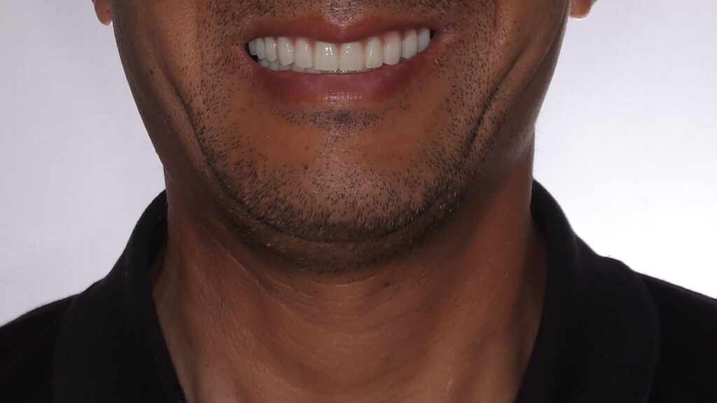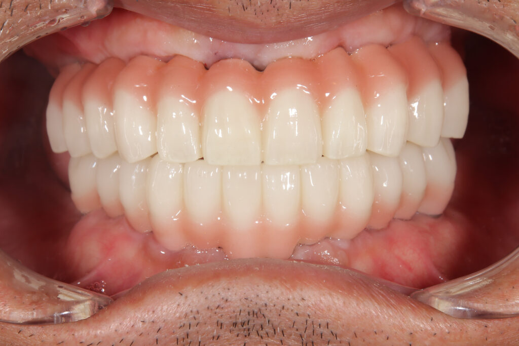 上下にオールオン4インプラント治療を行いました。少ない本数のインプラントで固定式の歯を作る方法で費用を抑えることができます。しっかり噛める、全体で噛み合わせを治せるため美しい仕上がりとなります。