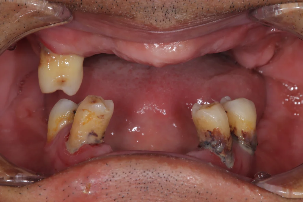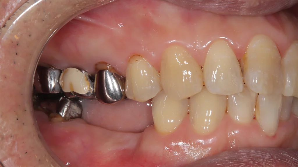 右下2本歯を抜いてから噛みにくくなり、抜けた後ろの銀歯もお痛みありインプラントご希望されました。銀歯を抜くと同時にインプラント2本埋め込み、歯を3本入れております。